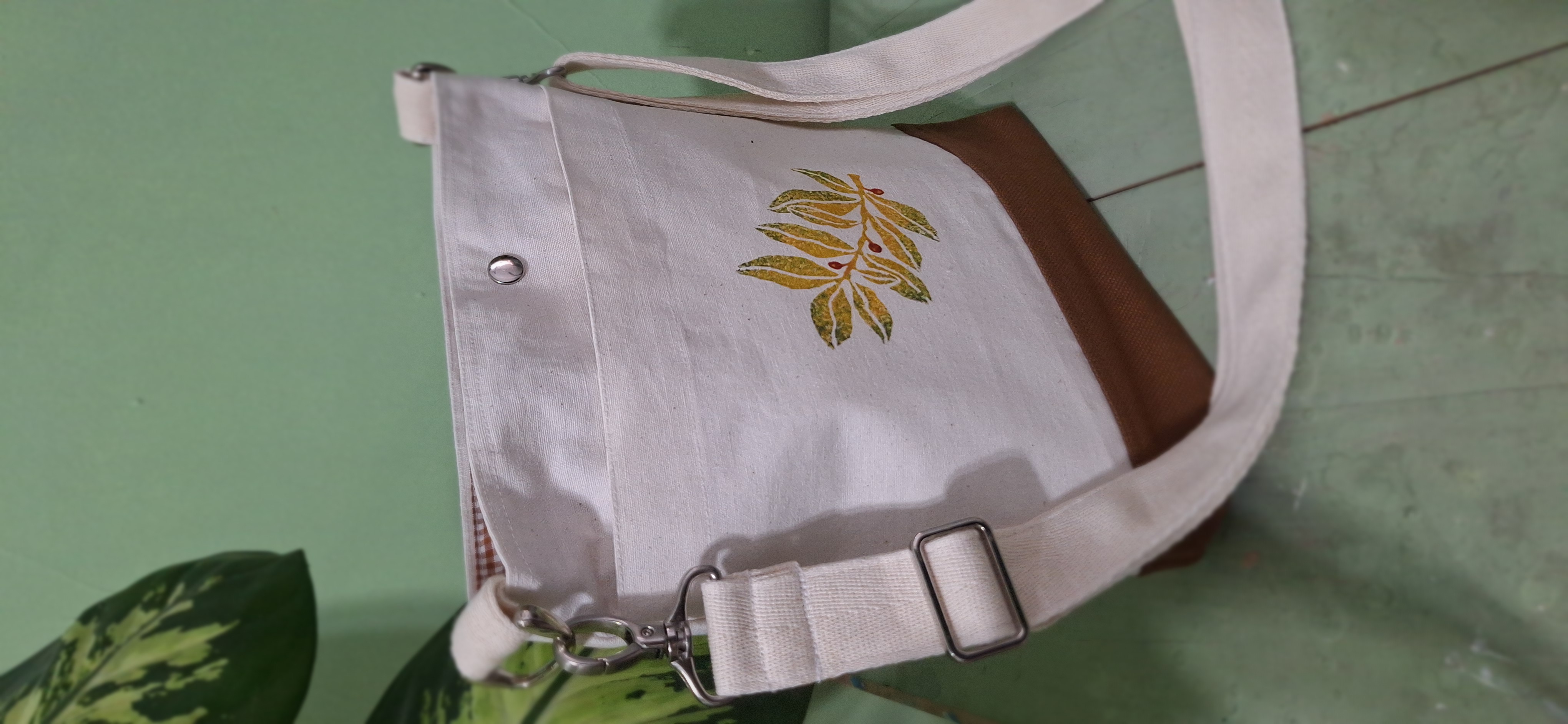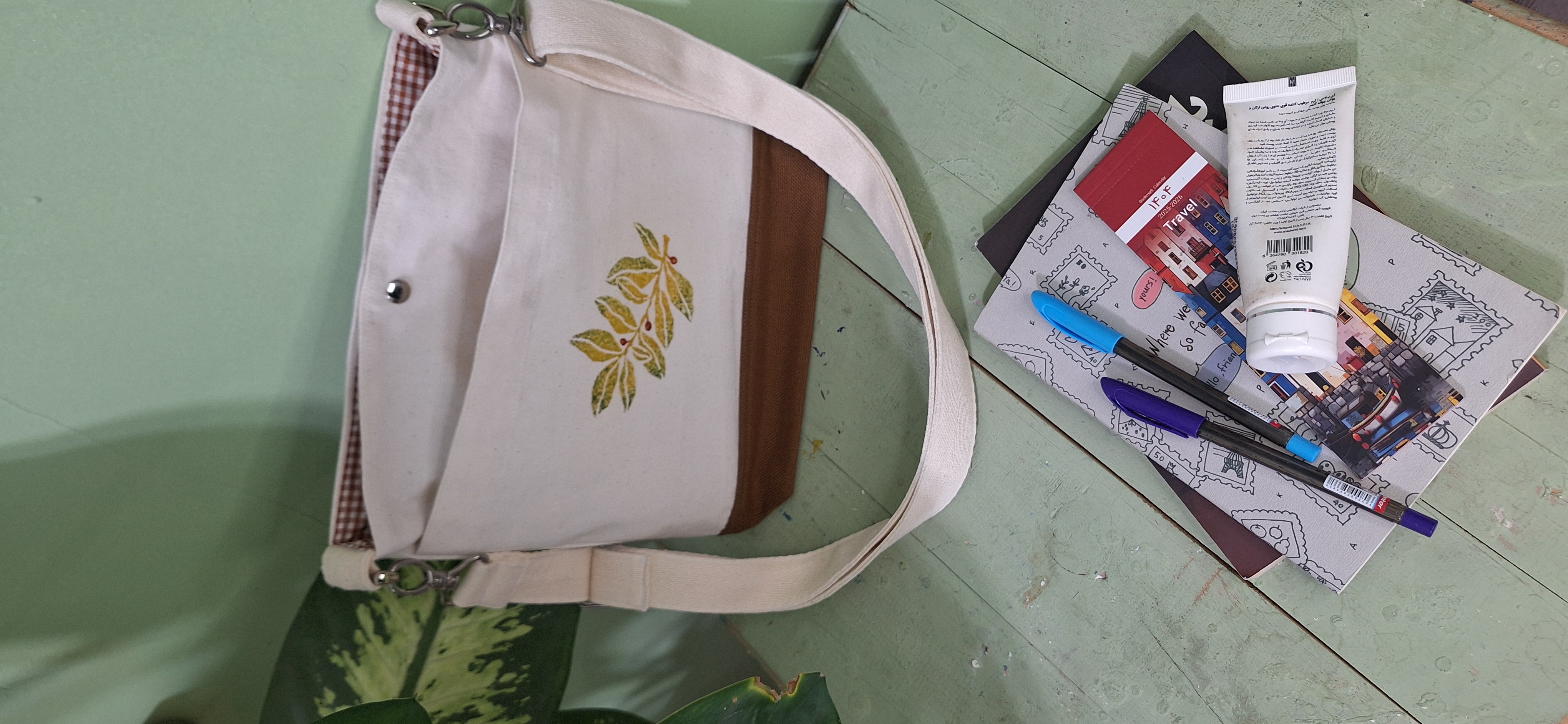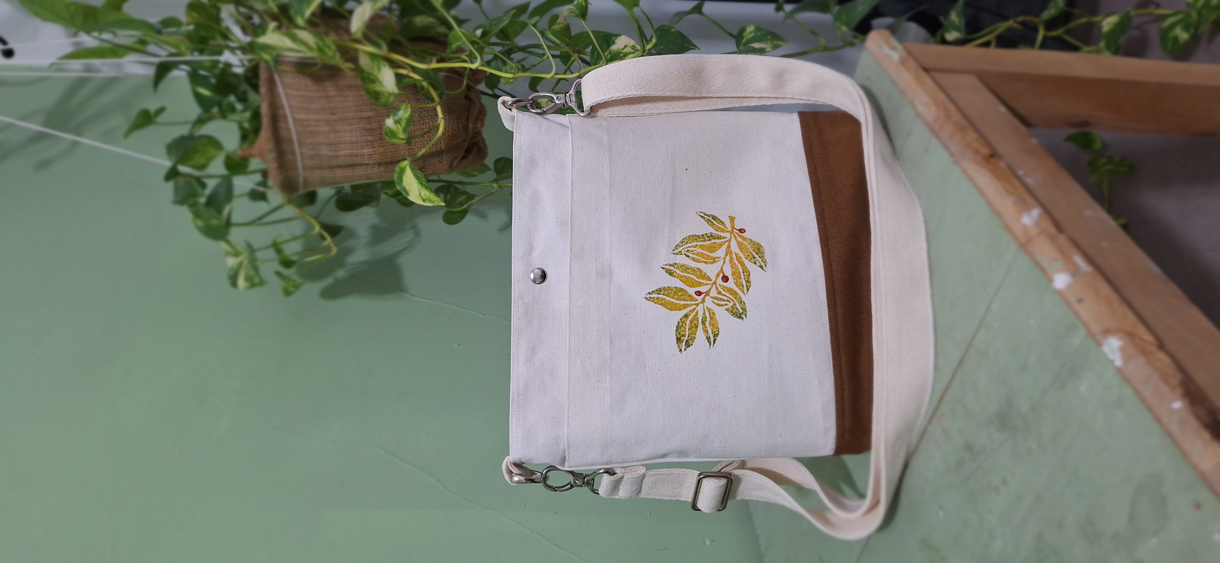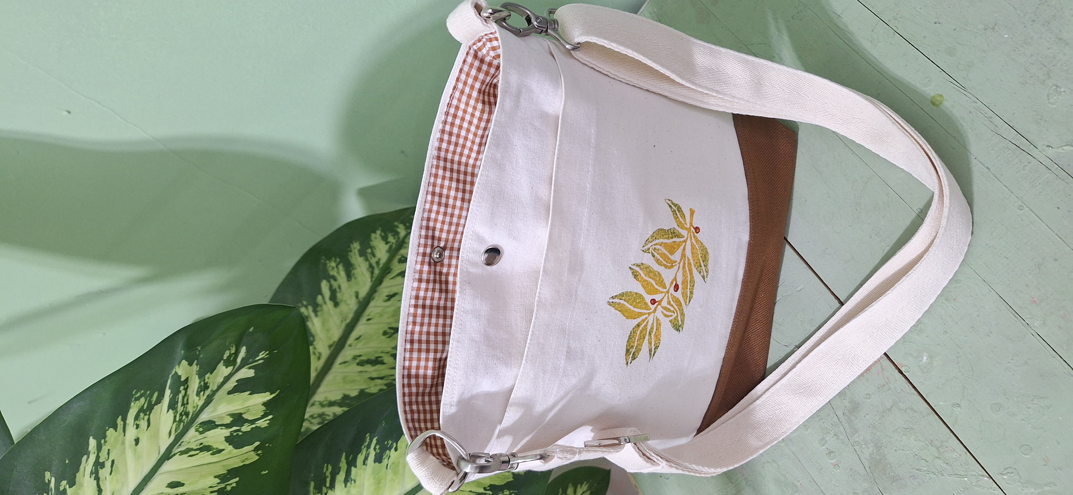 ساک پارچه ای طرح برگ از جنس نخ پنبه به بند قابل تنظیم . رنگ کفی کیف قابل تغییر است با رنگ های سبز یشمی،قهوه ای،مشکی،نسکافه ای،سرمه ای